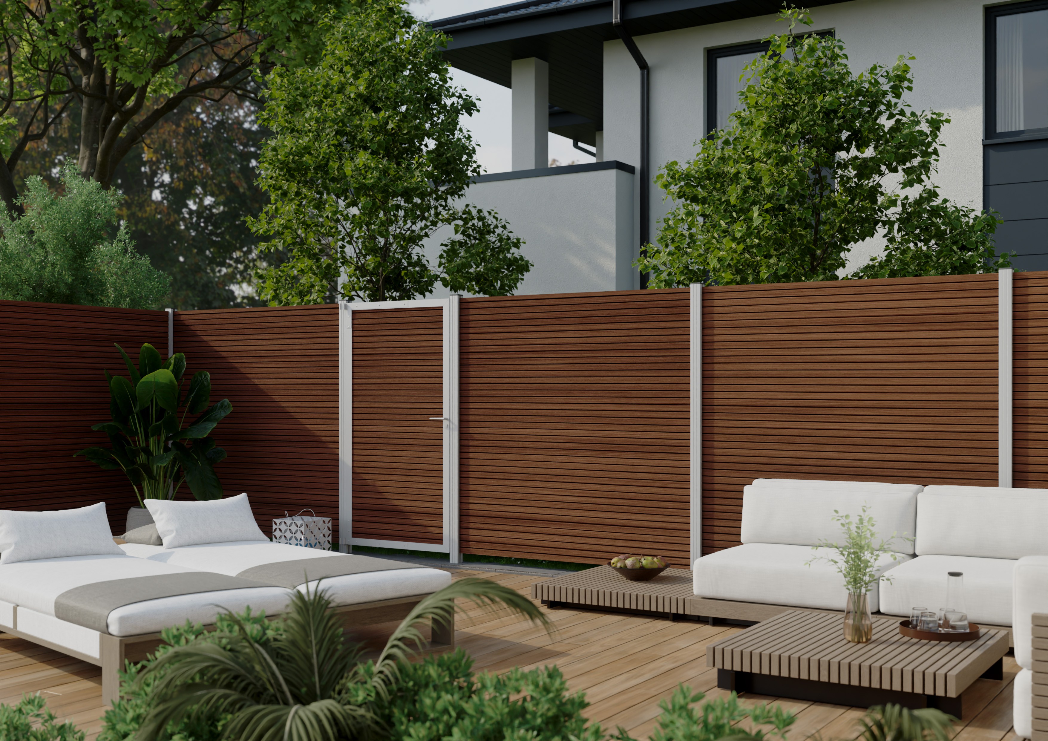 Das charakteristische Design wird durch die klare, horizontale Gliederung bestimmt: Präzise gearbeitete Schattenfugen zwischen den 10/11 BPC-Lamellen schaffen eine aufgelockerte und moderne Tiefenwirkung und garantieren effektiven Sichtschutz.