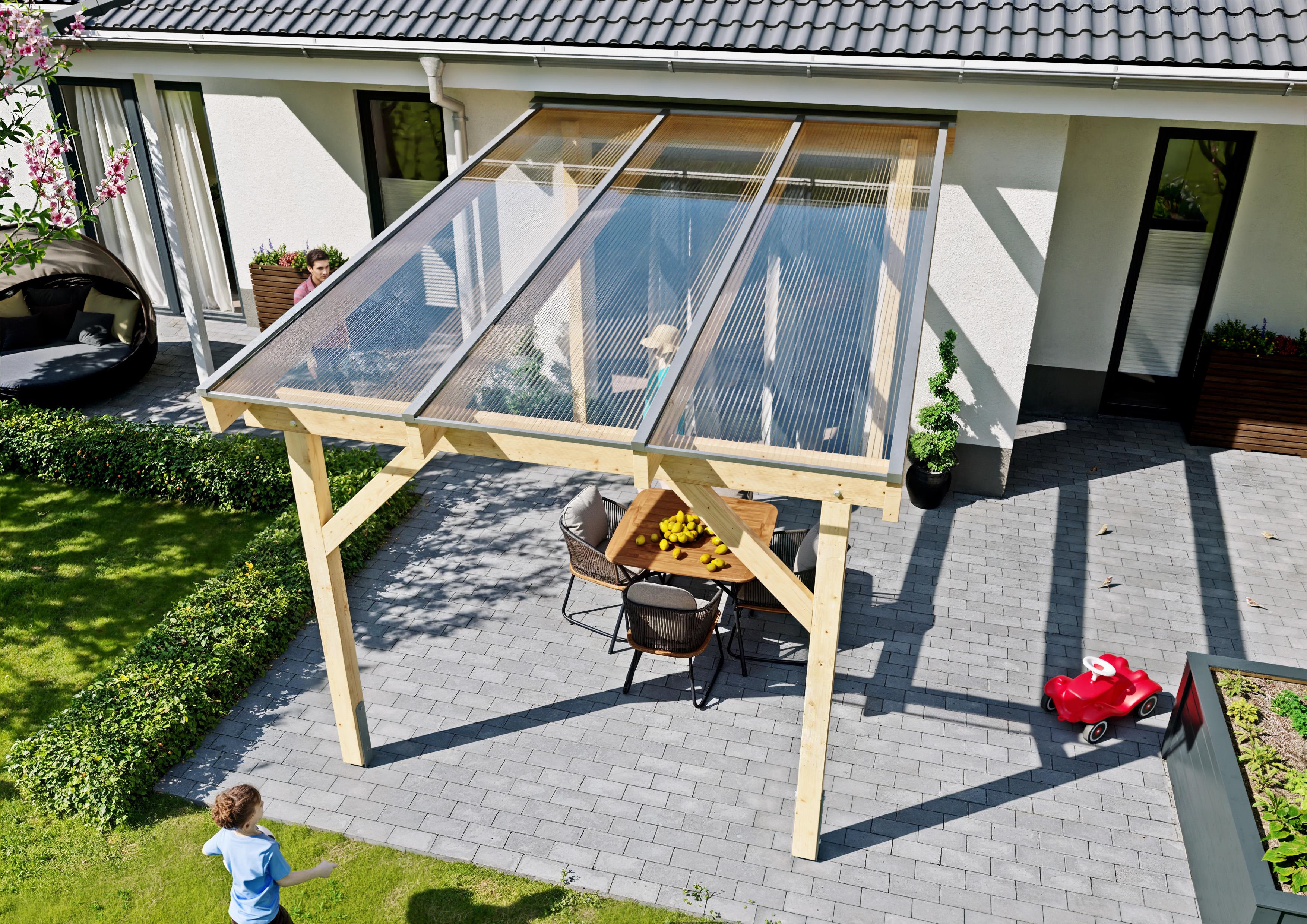 Mit unserem Terrassendach aus unbehandeltem Fichten-Leimholz investieren Sie in ein langlebiges, stabiles und individuell gestaltbares Produkt, das Ihre Terrasse zu einem gemütlichen und geschützten Rückzugsort macht. Wählen Sie die passende Bedachungsart und genießen Sie die Zeit im Freien, unabhängig vom Wetter.