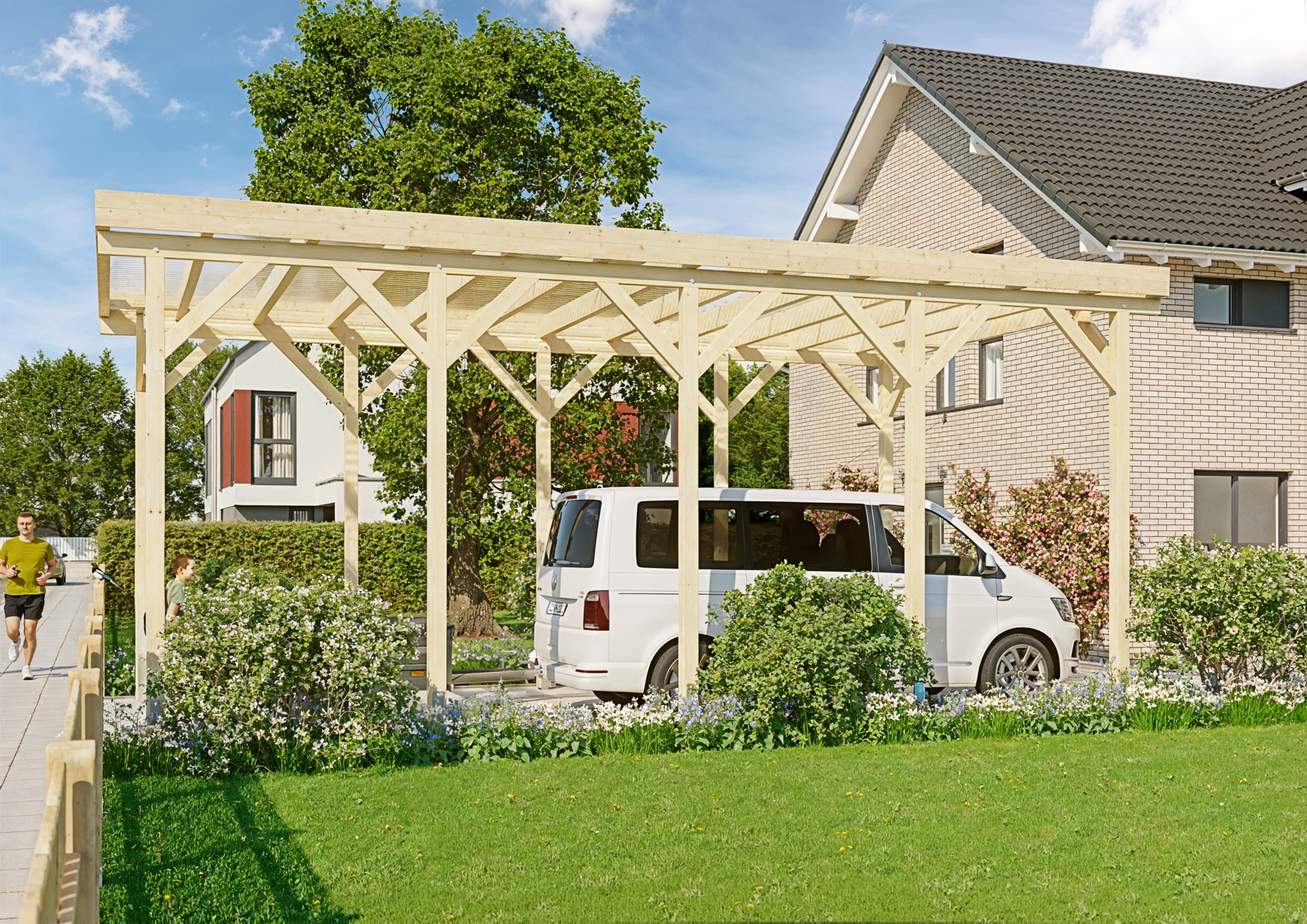Unsere unbehandelten Carports ermöglichen es Ihnen, Ihre individuellen Gestaltungswünsche umzusetzen. Sie können den Carport nach Belieben streichen oder lasieren und somit an Ihre persönlichen Vorlieben anpassen. Dadurch wird Ihr Carport zu einem echten Blickfang in Ihrem Garten.